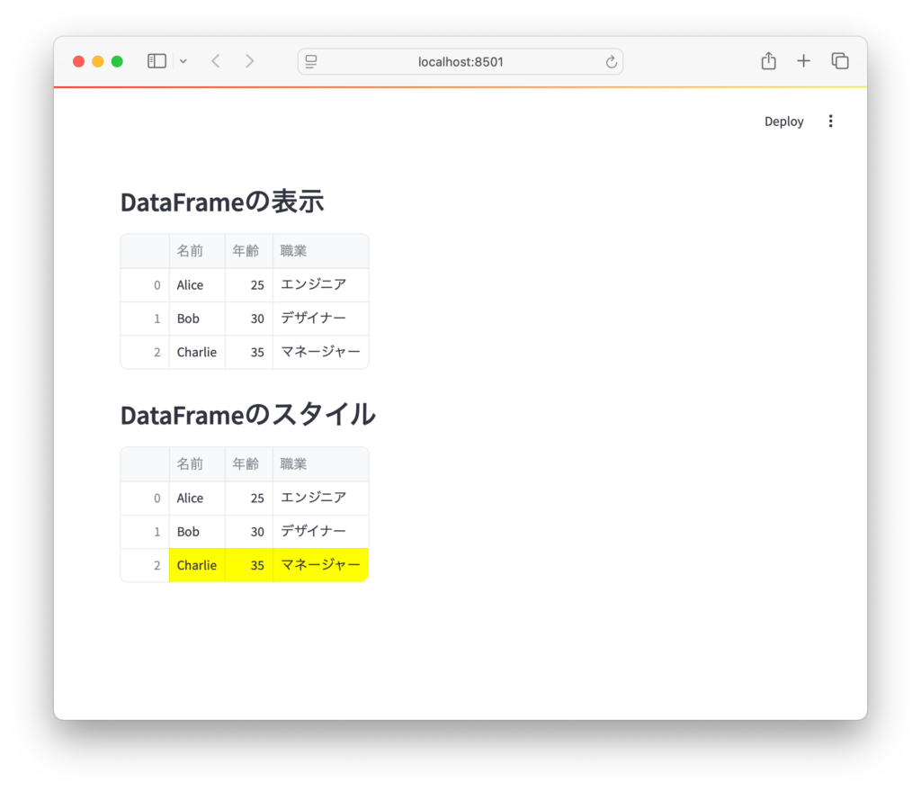 Streamlitでは、表形式のデータ(行と列があるもの)を表示するために以下の2つの関数を使います: