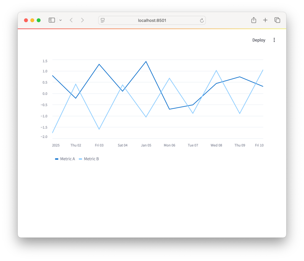 st.line_chart(data)このように、複数列のDataFrameを渡すだけで、それぞれの系列に自動で凡例が付きます。色分けも自動で行われ、比較がしやすくなります。