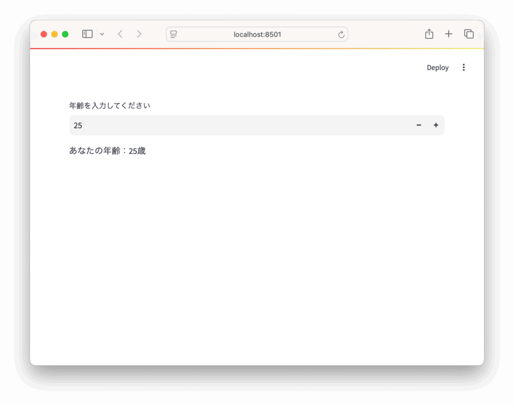 min_value=0:0歳未満は入力不可max_value=120:120歳以上は入力不可value=25:初期値として25を設定step=1:1ずつ増減