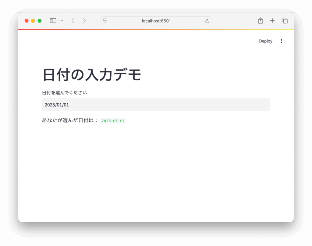 date = st.date_input("日付を選んでください", value=default_date)このように、value引数で初期日付を指定できます。datetime.date(年, 月, 日)の形式で日付を設定します。