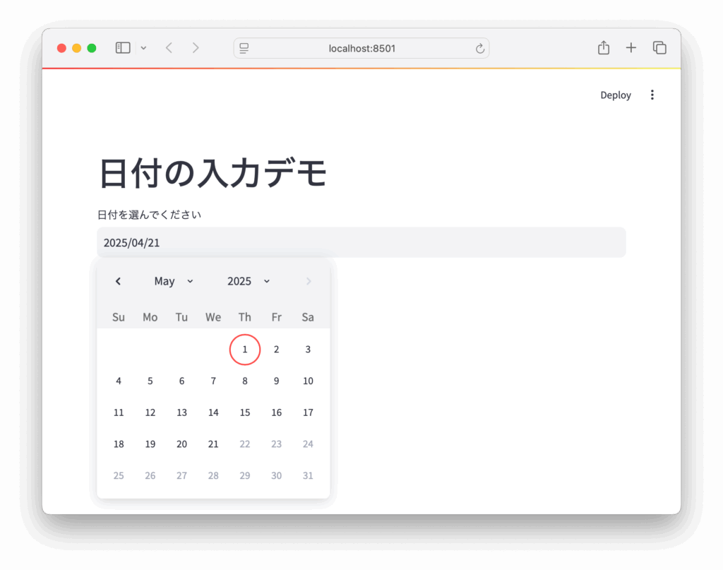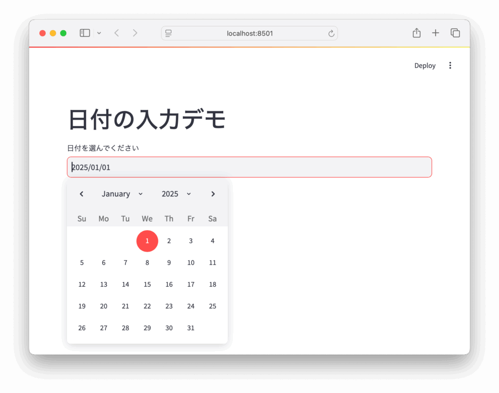 st.write("あなたが選んだ日付は:", date)これを実行すると、日付選択カレンダーが表示され、選んだ日付が下に表示されます。