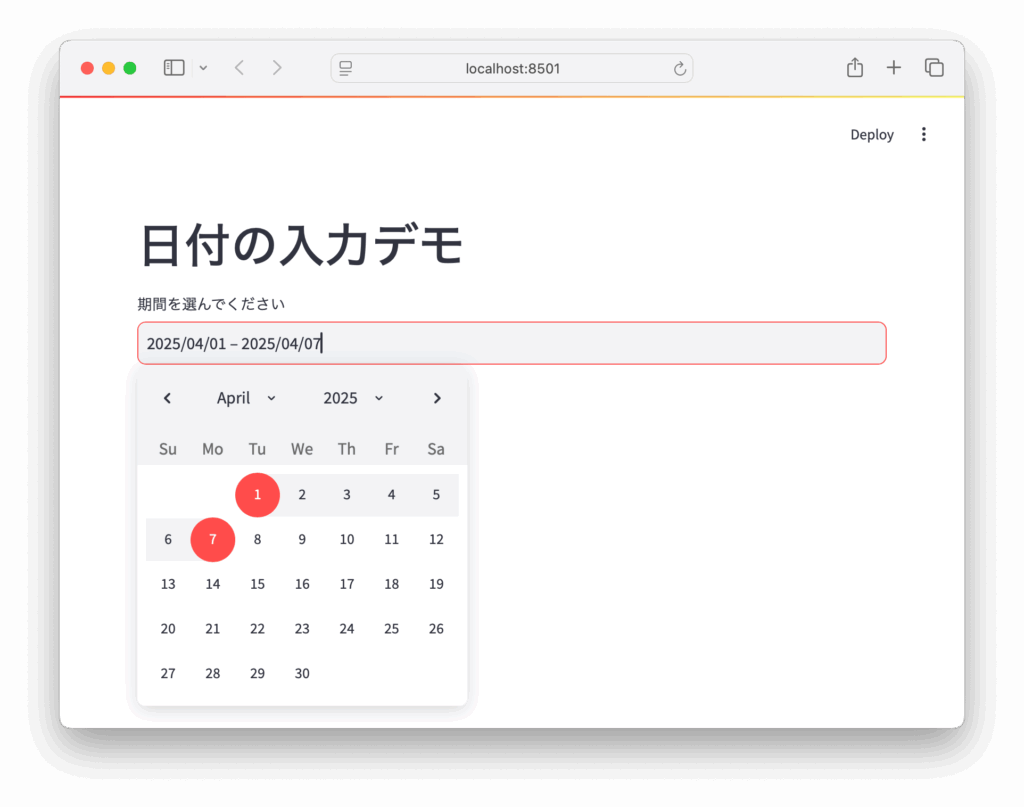 st.date_inputは、リスト形式で初期値を渡すことで開始日と終了日を選ぶUIにもなります。