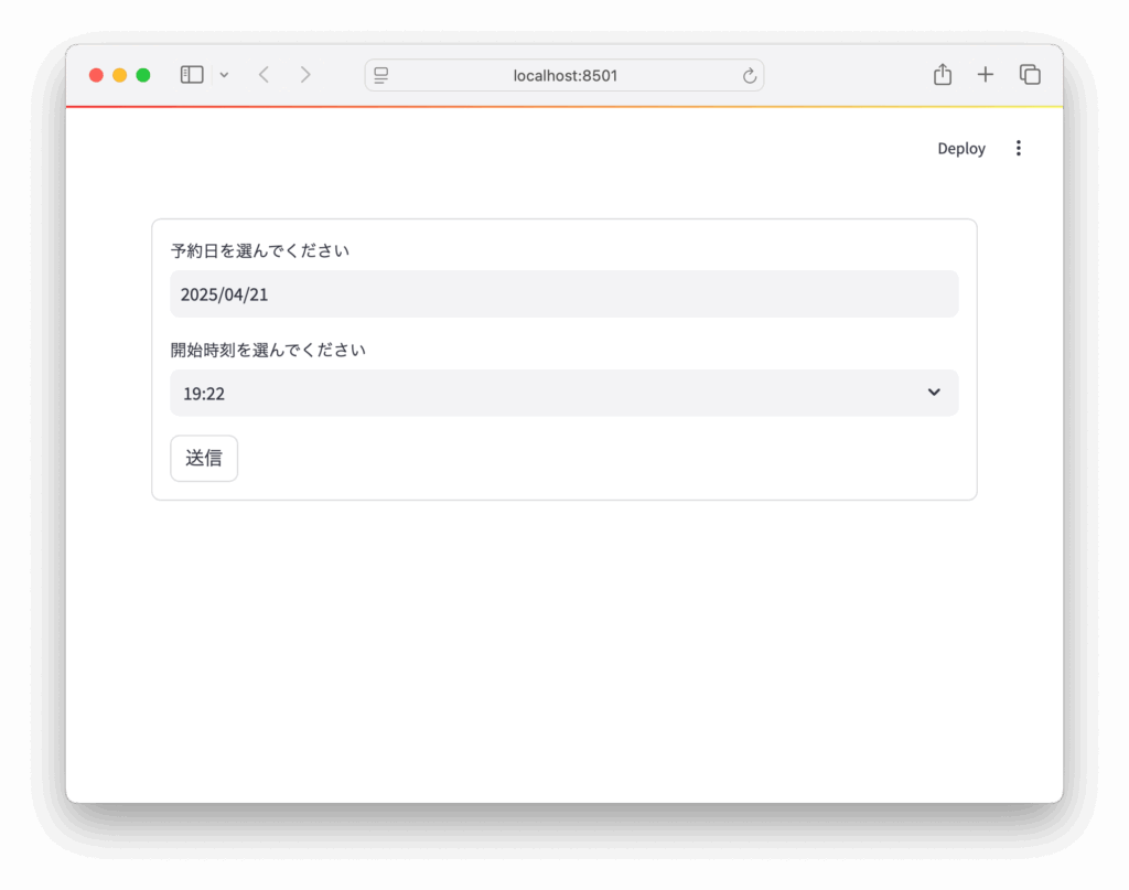 st.write(f"予約日時:{datetime.combine(date, time)}")これで、ユーザーが日付と時間を選んで「送信」を押したときにだけ処理が走るようになります。