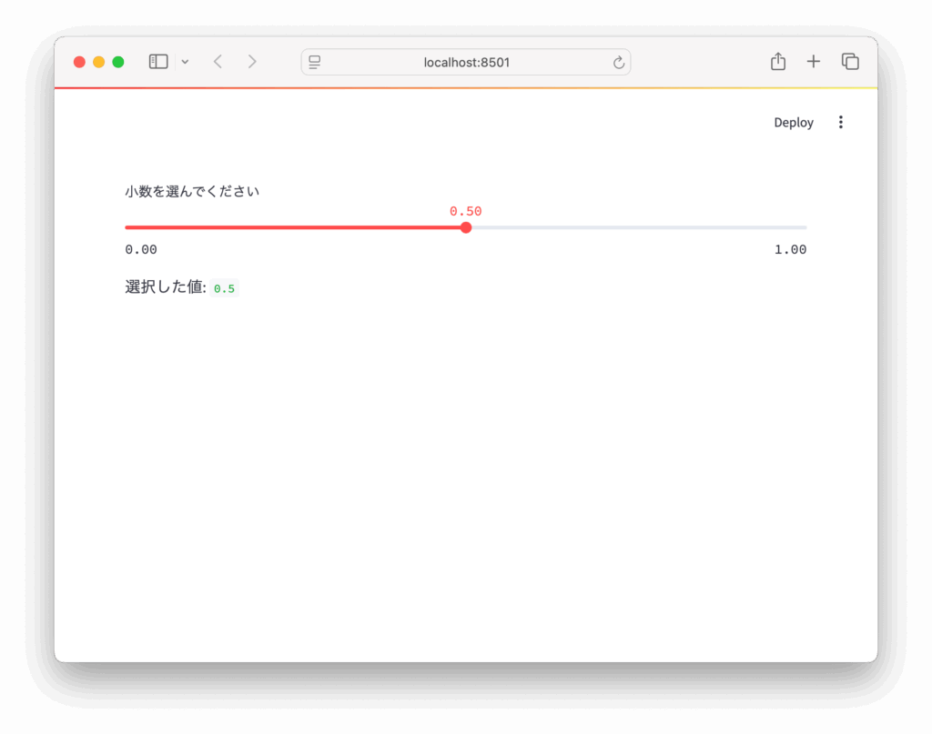 float_value = st.slider('小数を選んでください', 0.0, 1.0, 0.5, 0.01)