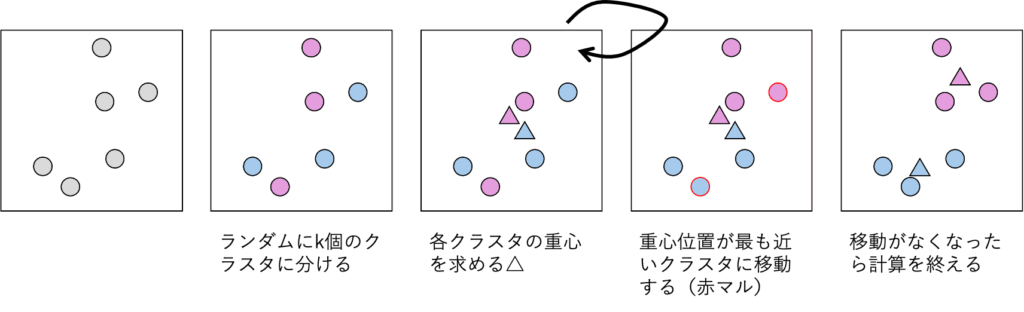 データ点 → クラスタに割り当て → 重心更新 → 再割り当て → ...