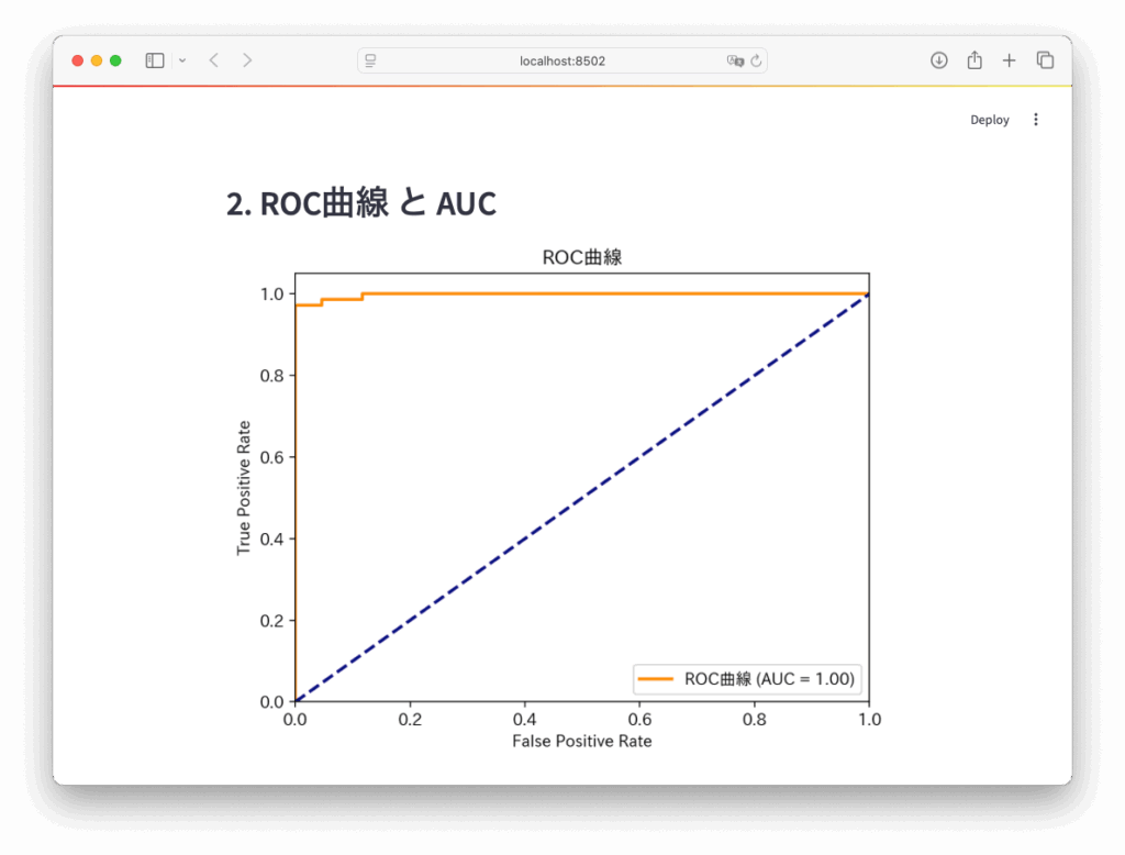 • 作成したグラフ fig_roc を Streamlit アプリ上に描画・表示します。