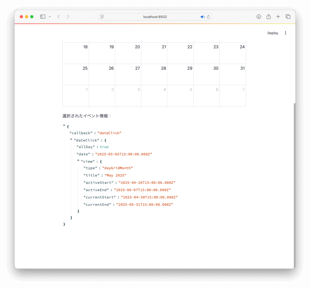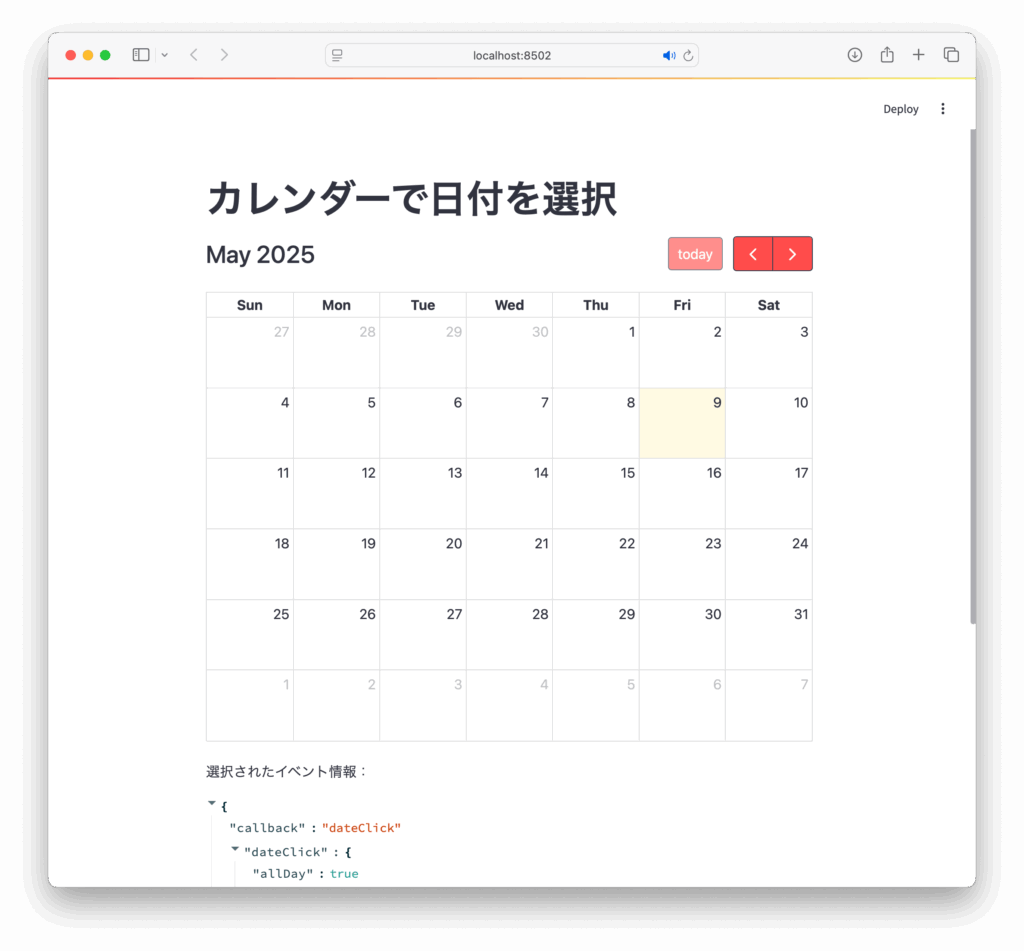 calendar()を呼び出すと、月間カレンダー形式のUIが表示されます。- カレンダーにイベントを追加したり、日付をクリックするとイベントデータが辞書形式で返ってきます。