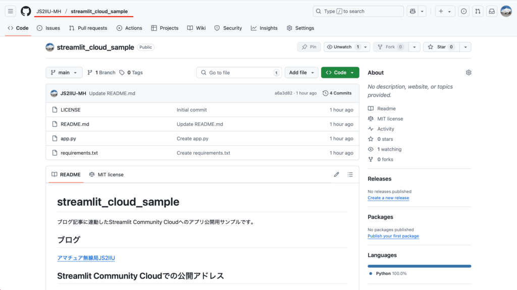 | Repository | ユーザー名/リポジトリ名(例:yourname/hello-streamlit) |