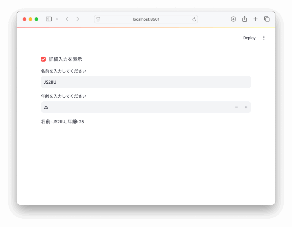 st.write(f"名前: {name}, 年齢: {age}")