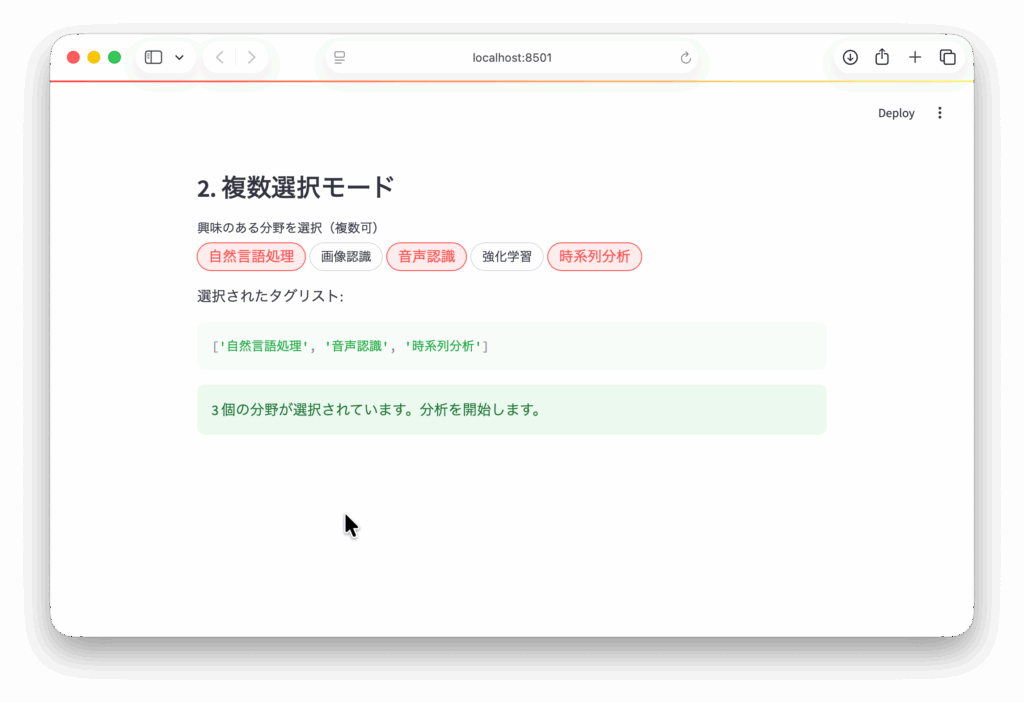 • 戻り値の変化: 単一選択の時は「文字列」が返ってきましたが、複数選択モードでは「選択された文字列のリスト」が返ってきます(例: ['自然言語処理', '強化学習'])。