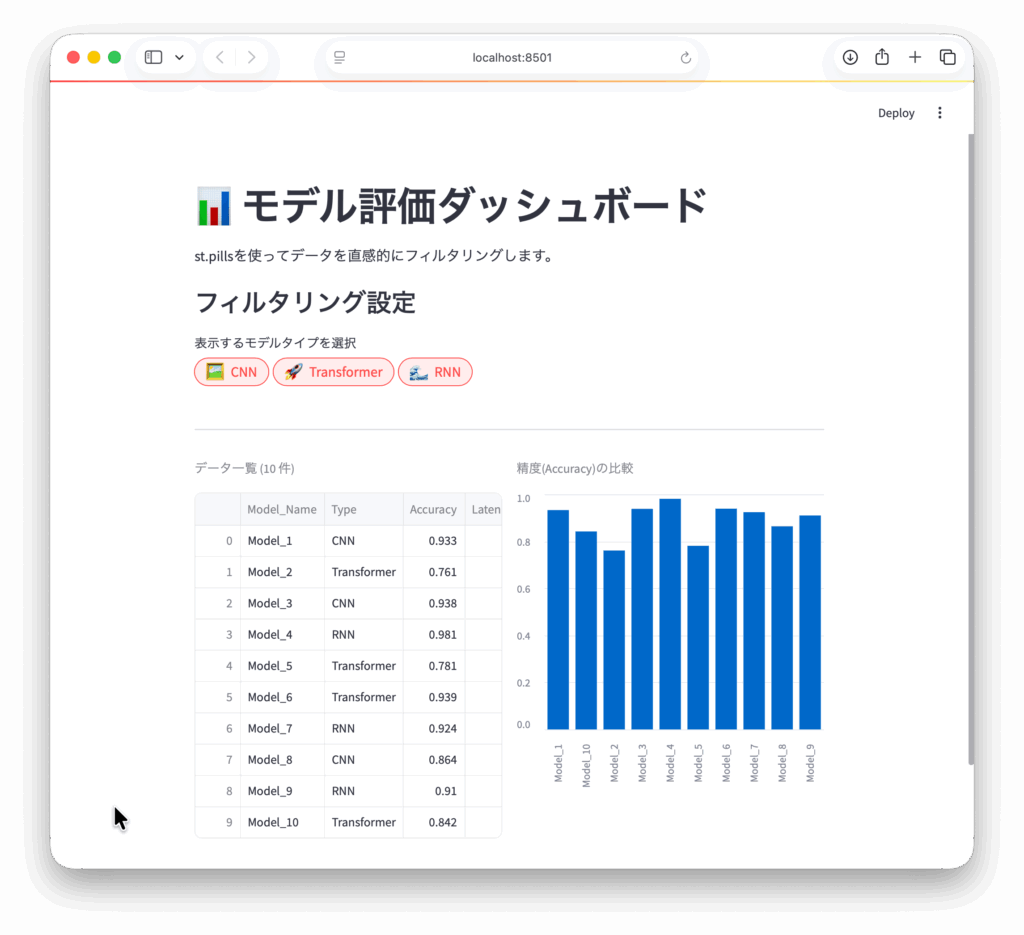 3. インタラクティブな体験: ユーザーが「Transformer」のボタンをポチッと外せば、即座に表とグラフからTransformerモデルが消えます。このサクサク動く体験こそが、モダンなデータアプリの醍醐味です。