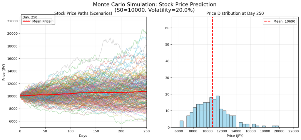 プログラミングにおいて、確定的なアルゴリズムだけでなく、このような「確率的なアプローチ」を身につけると、解決できる問題の幅が劇的に広がります。ぜひ、パラメータ(ボラティリティや期間)を変えて実験し、確率の世界を楽しんでみてください。