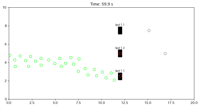 動画を見ると、処理の遅いレジ(Speed値が大きい)には長い行列ができ、速いレジはサクサク進む様子が確認できるはずです。また、エージェントが会計(赤色)に入ると、後ろの列がピタリと止まり、終わると一斉に動き出す「芋づる式」の動きも再現できています。