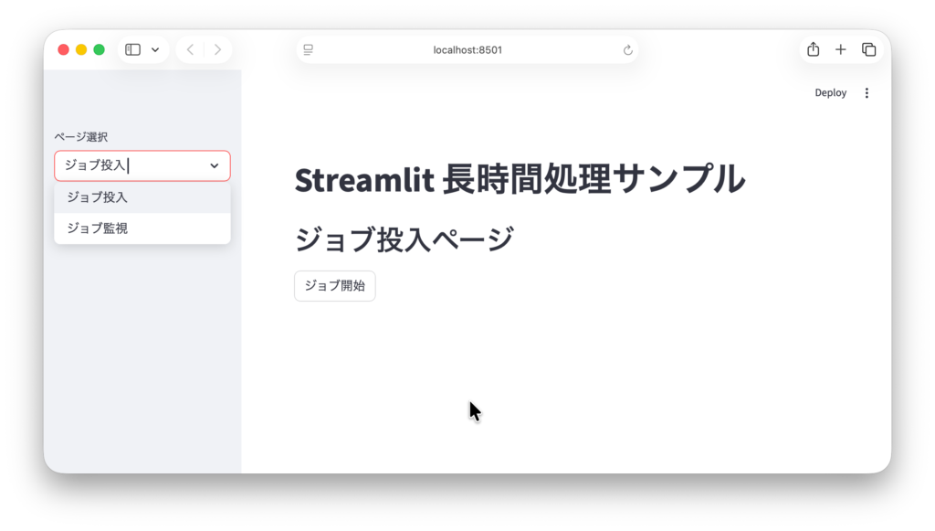 Streamlit 側では、ユーザーがジョブを投入(登録)するページと、ジョブの進捗や状態を監視するページを分離して設計します。これにより、UIの操作とバックグラウンド処理の実行が明確に分離され、アプリの保守性・拡張性が向上します。