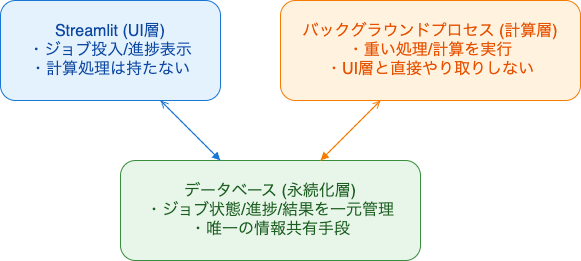 - UI層と処理層の明確な分離:UI(Streamlit)はジョブの登録・進捗表示のみを担当し、重い計算処理は必ずバックグラウンドで独立して実行する。