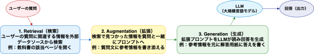 - Generation(生成): LLMが、拡張されたプロンプトを読み、コンテキストに基づいて回答を生成します。「参考情報を元に解答用紙に答えを書く」作業です。