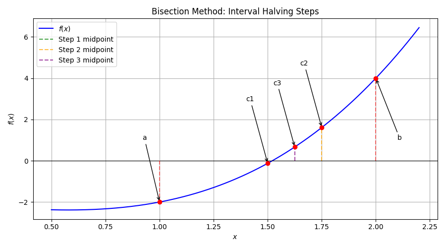 - \(f(a)\) と \(f(c)\) の符号が異なれば、新しい区間を \([a, c]\) とする。そうでなければ \([c, b]\) とする。