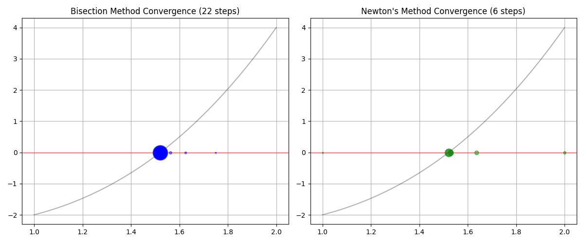最後に、2分法とニュートン法がどのように解に近づいていくのか、その軌跡をグラフにして比較してみましょう。