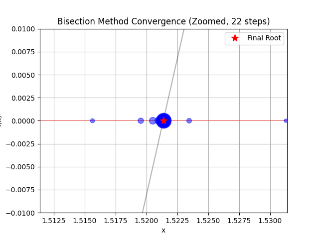 - 収束速度: 1ステップごとに区間幅が半分になるため、収束は「1次収束」(線形収束)であり、他の手法(ニュートン法など)に比べて遅いです。