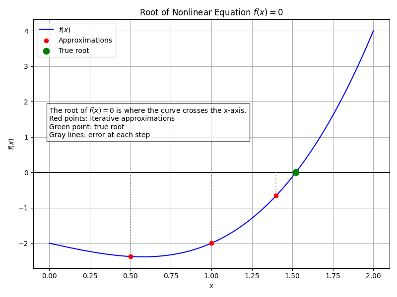非線形方程式 \(f(x) = 0\) を解くとは、グラフ上で曲線が \(x\) 軸と交わる点(根)を探す作業です。多くの場合、この \(x\) を代数的に(\(x = \dots\) の形に)求めることは不可能です。