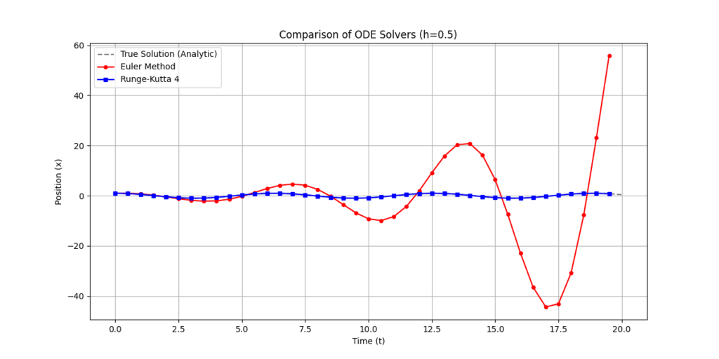 stateを[位置, 速度]というベクトルで扱うことで、単一の変数と同じようにルンゲ・クッタの公式を適用しています。 - 誤差の現れ方: グラフを見ると、オイラー法はステップが進むにつれて振幅がどんどん大きくなってしまっているのがわかります(エネルギーが不当に増加している)。一方、RK4は同じステップ幅でも真の解(点線)にほぼ完璧に重なっています。