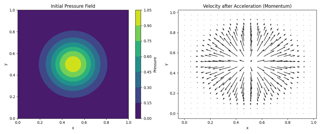 - Pythonを用いて、圧力勾配が速度場を生み出すプロセスを実装。