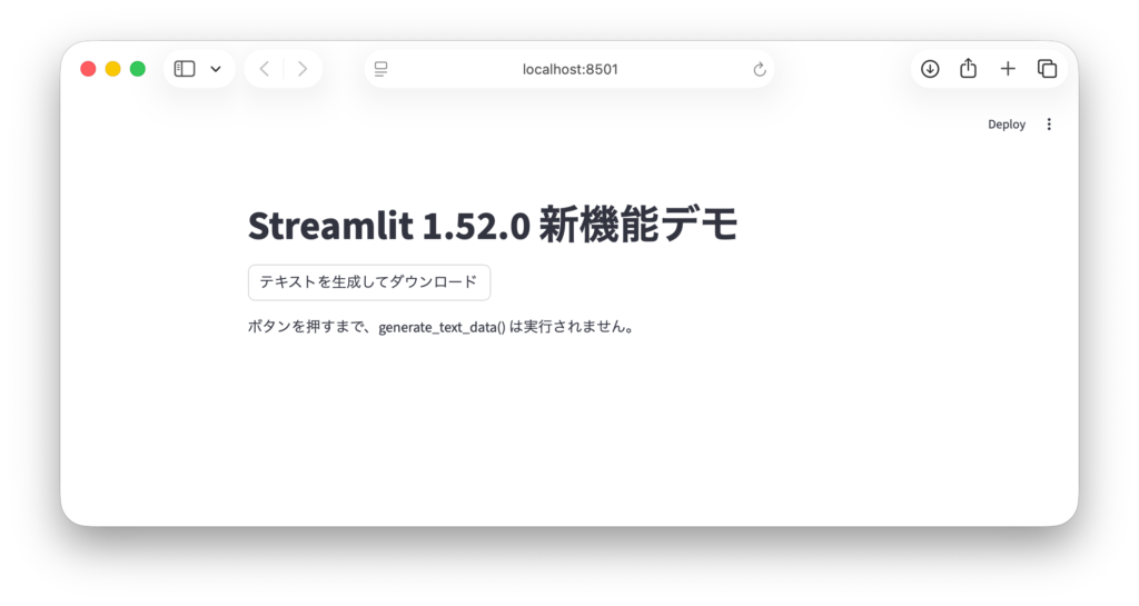 上記のコードにおいて、data=generate_text_data と記述している点に注目してください。ここで generate_text_data() (括弧あり)と書いてしまうと、その場で実行されてしまい、従来と同じ動作になります。関数オブジェクトをそのまま渡すことで、Streamlit側が必要な時(クリック時)にのみその関数を呼び出してくれるようになります。