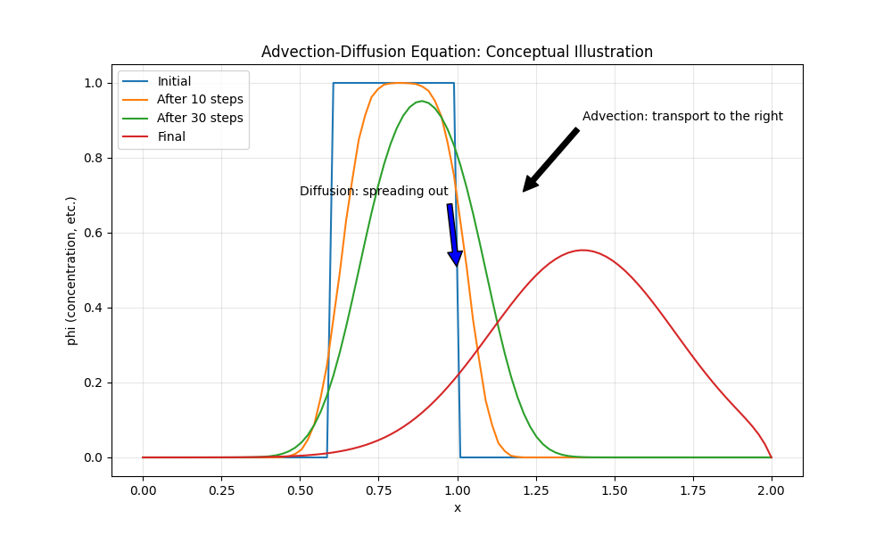 - \(u \frac{\partial \phi}{\partial x}\): 移流項(流れによる物理量の輸送。流速\(u\)の方向に情報が伝播する)