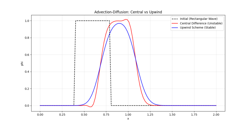 この現象の本質は、数値安定性と情報伝播の方向性にあります。中心差分は「右側の情報」と「左側の情報」を対称的に扱うため、物理的な流れの方向(上流→下流)を無視してしまいます。移流項は本来、情報が上流から下流へ一方向に伝わる性質(双曲型PDEの特徴)を持っていますが、中心差分は下流側の値も参照してしまうため、物理的な因果関係と計算上の参照関係が矛盾します。