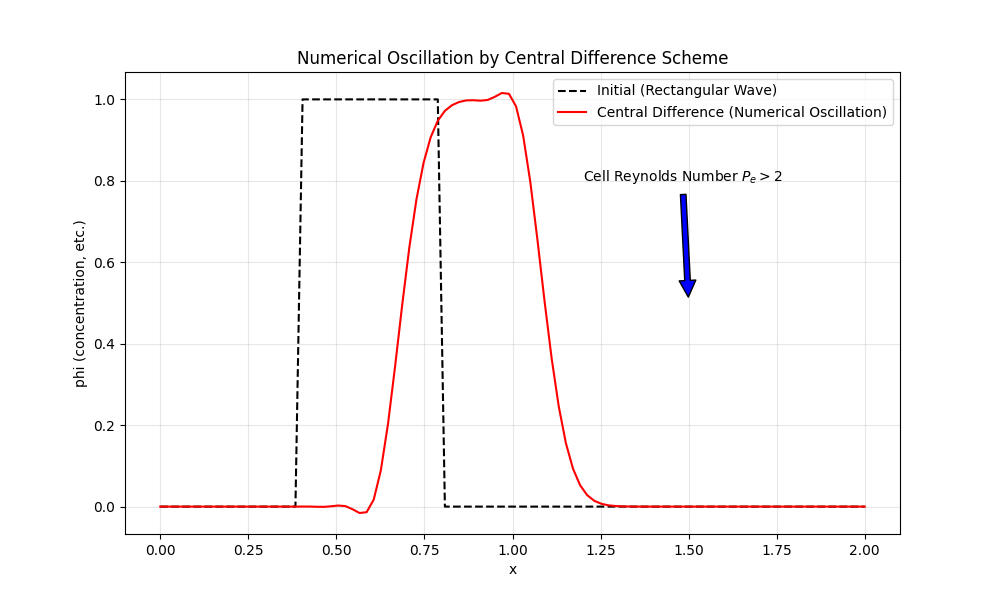 しかし、移流が非常に強い((u) が大きく、(\nu) が小さい)状況、すなわち拡散よりも移流が支配的な場合に中心差分を用いると、計算結果に不自然なギザギザの波(高周波成分)が現れることがあります。これを数値的振動(Numerical Oscillation)と呼びます。