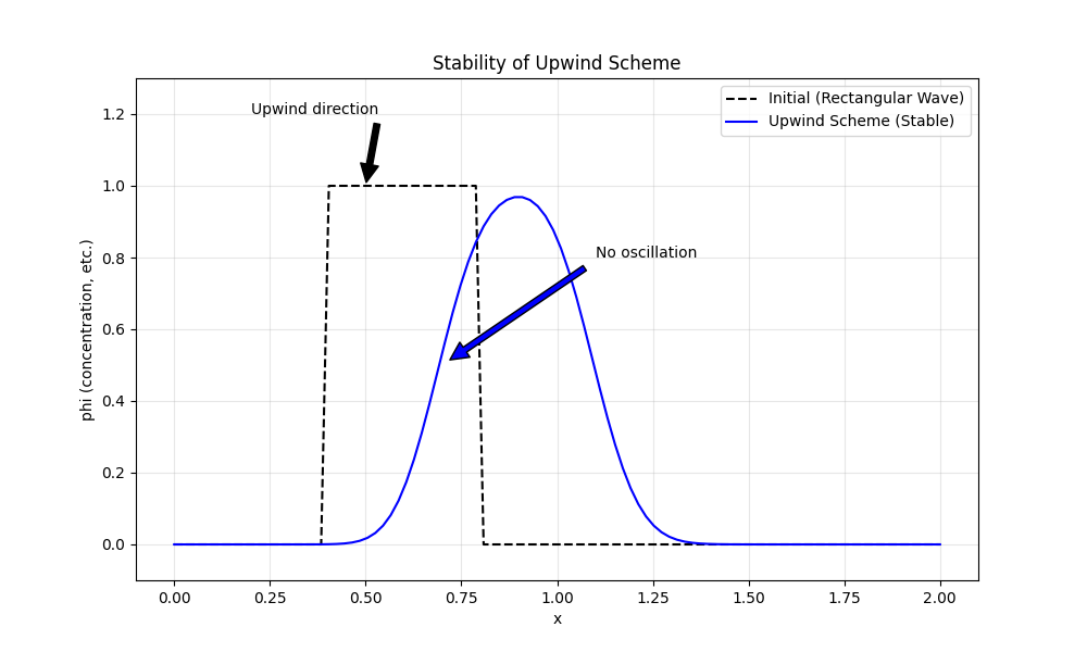 上流差分法は、物理現象の「因果律」を数値計算に忠実に反映する手法です。流れのある系では、情報は必ず上流から下流へ伝わるため、下流側の値を参照しないことで、物理的な矛盾や数値的な不安定性を回避できます。