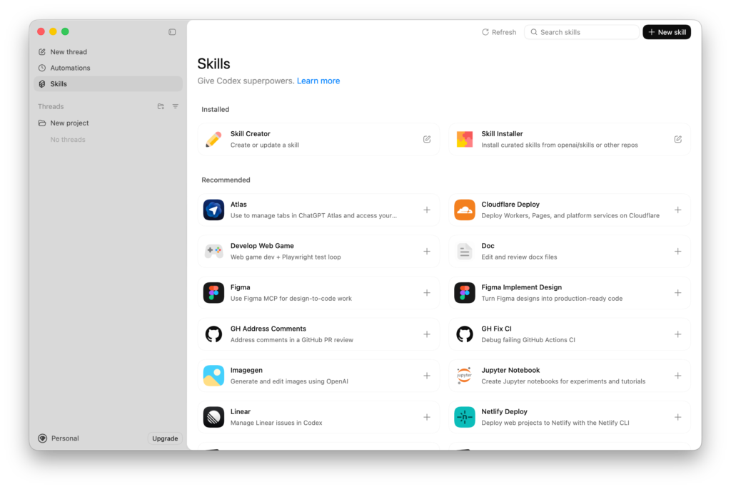 Codex Appでは簡単にAutomationsやSkillsを構築することができます。プリセットされたAutomationやSkillがUI上で選択できるようになっています。これはとっつきやすそうです。
